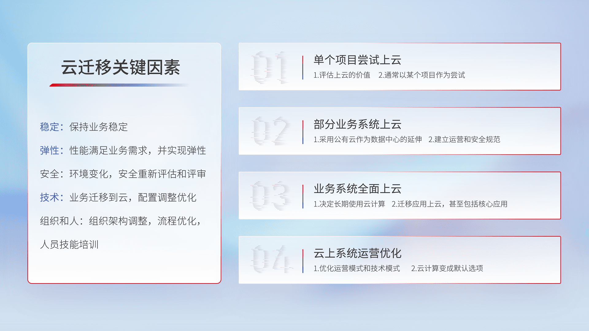 结合实际业务,,从规划设计、、云平台选型、、、云原生改造、、数据迁移、、、、集成交付,,,,迁移全过程为客户识别最佳上云路径,,做好风险识别管理,,,设计网络架构、、、、身份权限、、、、安全审计合规、、、操作审计、、、日志审计、、监控告警策略、、、、多站点容灾设计等,,,,对云上基础设施进行整体规划,,提升IT治理水平,,,,以满足弹性、、高可用、、、、高性能的需求。。。。
