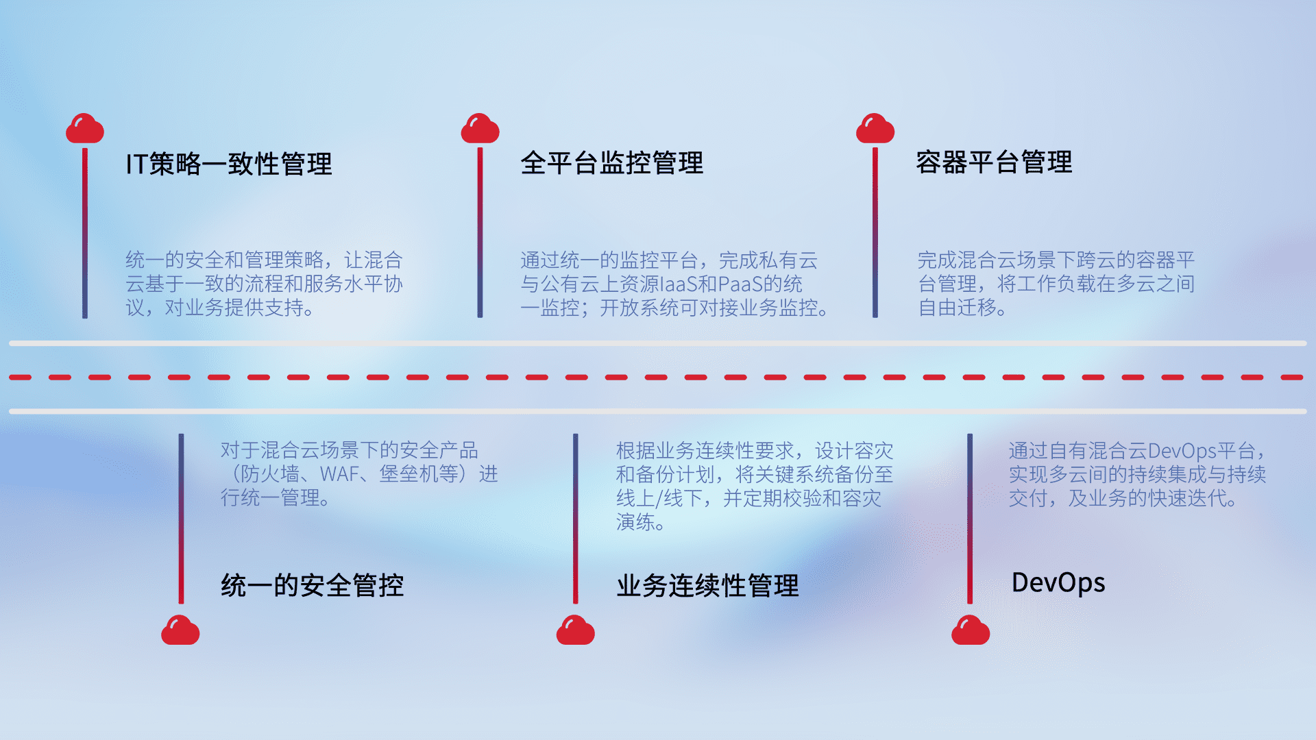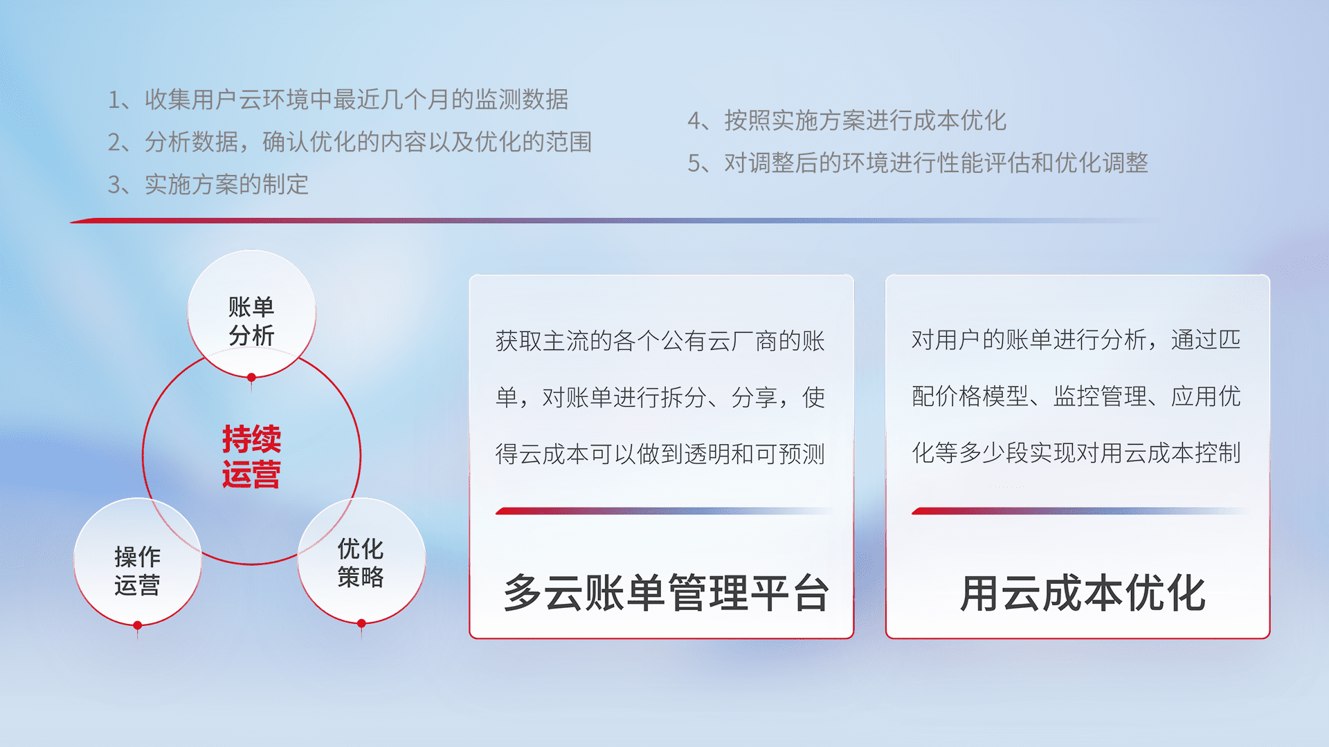 通过多云纳管,,以统一的资源数据模型把客户的云资源进行抽象和封装,,,进而实现对多云资源的统一操作,,保障云资源管理的可靠性、、、稳定性与可用性。。。。量身定制化运维内容,,配置、、开发运维、、、补丁管理、、、备份、、、、监控、、认证和访问管理、、审计和日常巡检等,,保障在用云过程中的可靠度,,,,稳定度以及高可用率。。。。