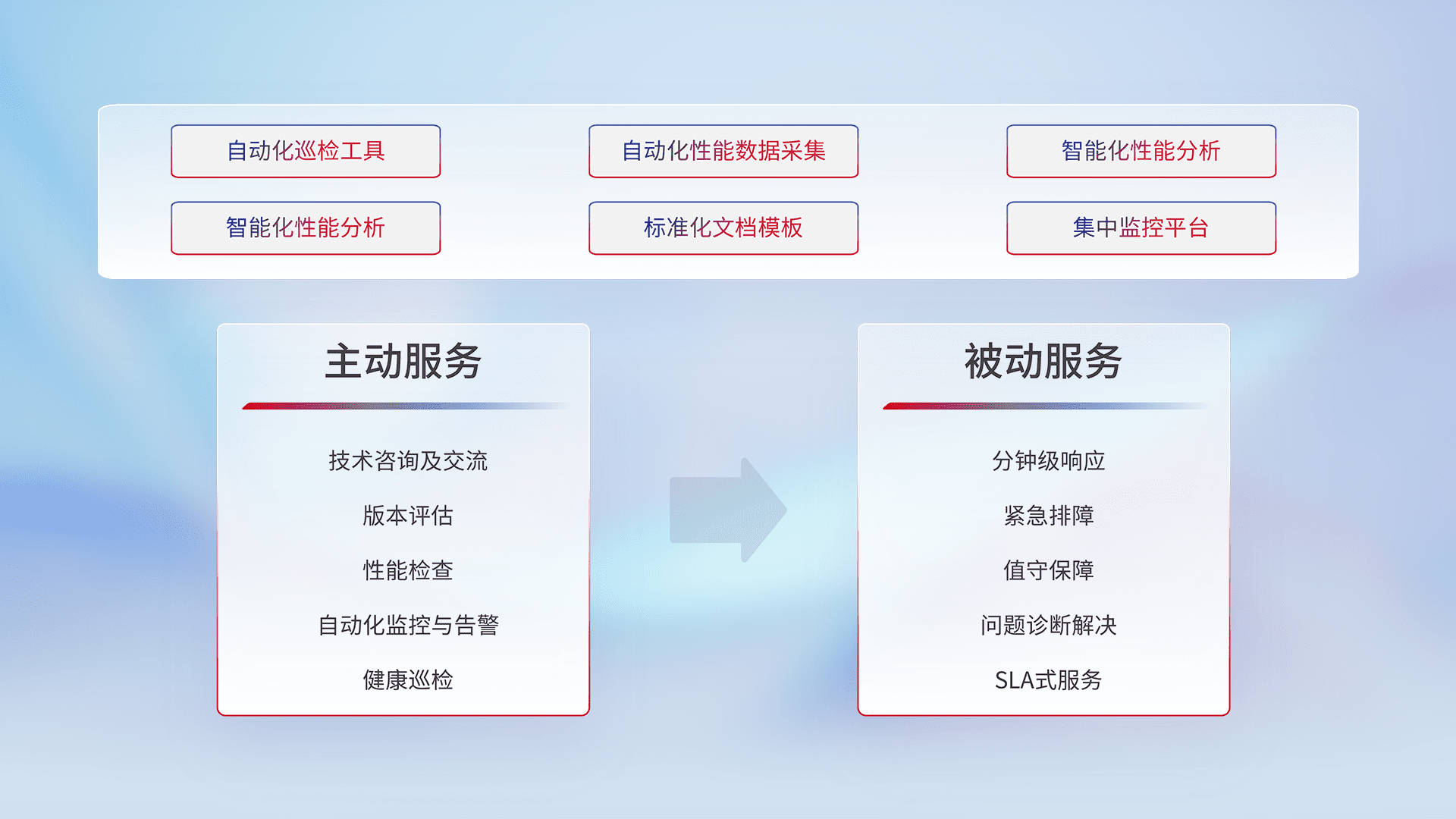 智能化工具和标准化文档,,,保障服务质量,,,,提供主动服务(包含技术咨询、、版本评估、、、性能检查、、、、自动化监控与告警、、健康巡检)和被动服务包含(分钟级响应、、、、紧急排障、、值守保障、、、、问题诊断解决、、SLA服务)。。