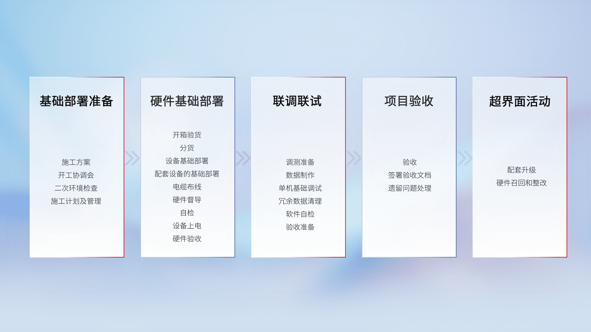 从基础部署准备、、硬件基础部署、、、联调联试、、、、项目验收、、、越界面活动的全过程可追溯,,保证施工质量和进度。。。